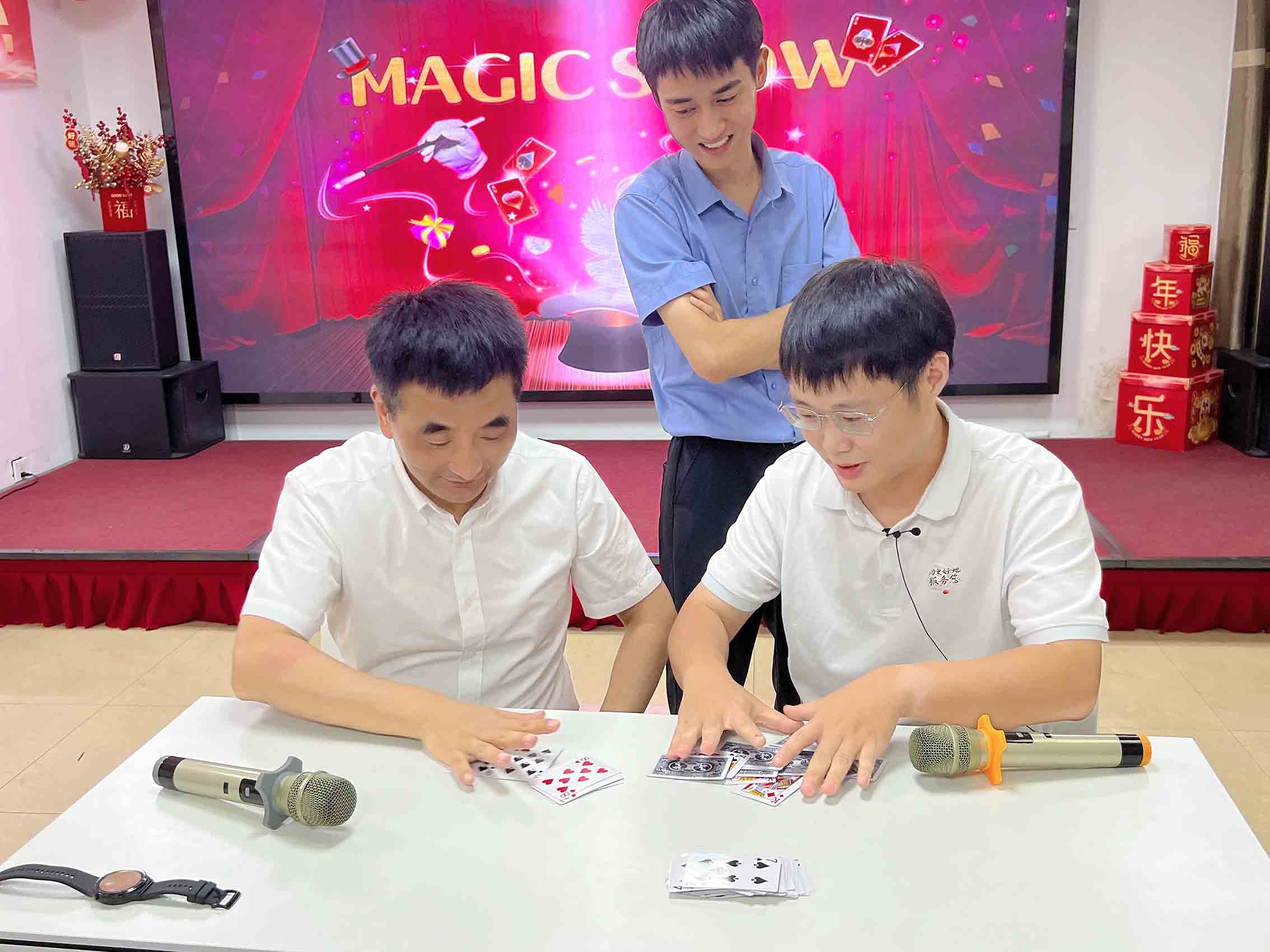 緊接著,售后部的同事化身為魔術師,手持一副普通的撲克牌,卻仿佛擁有了讀心術一般。在觀眾的注視下,他特意邀請了我們總經(jīng)理上臺參與互動。魔術師先讓總經(jīng)理隨機選取一張牌并牢記,隨后將牌放回牌堆中洗牌。令人驚奇的是,無論牌堆如何被打亂,魔術師總能猜出牌面。